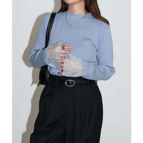 チュール シアー 袖 フリル 長袖 リブ ニット トップス
