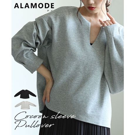 【トップス】 プルオーバー トレーナー キーネック コクーン タック 長袖 無地 ブラック グレー