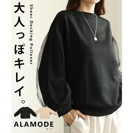 【トレーナー】 トップス カットソー プルオーバー ブラック 黒 オフホワイト 長袖 チュール 秋服