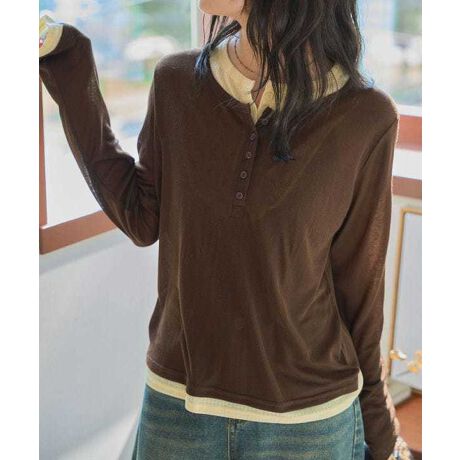 こなれ感のある着こなしを演出するレイヤード風ヘンリーネックトップス。