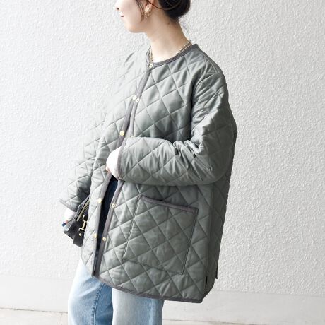 ブランドを代表するノーカラーキルティングコート、ARKLEY(アークリー)のミドル丈Aラインモデル。