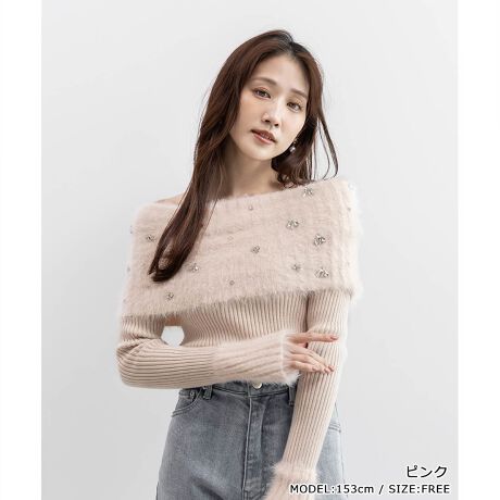 ビジュー×シャギーで顔周りを華やかに彩ってくれるオフショルダーニット。