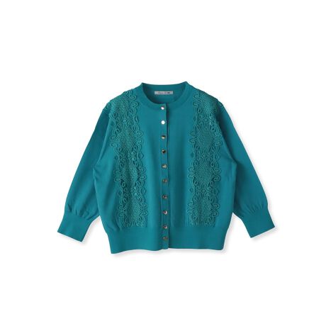 前身頃を繊細なレース刺繍で切り替えた、華やかカーディガン。