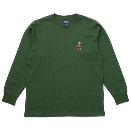 [型番:RM8-C002]オーガニックコットン100%のワッフル編地を使用したロングスリーブクルーネックシャツです。袖口のリブが保温性を高めるとともに、スタイリッシュな印象を演出。左胸に入れたアイコニックなPOLOベア(ホリデーベア)の刺繍もポイントの、幅広いシーンで活用できる定番アイテム。ギフトにも最適です。同素材を使用したジョガーパンツ(RM8-C101)も展開しているので、セットアップでの着用もオススメです。