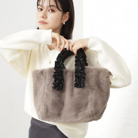 やわらかいフェイクファーを使用したトート型バッグは、洗練されたフリルハンドディテールが特徴で、女性らしい優雅な印象を演出します。