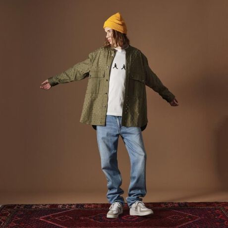 ミリタリー風なデザインと一風変わった素材で仕立てたオーバーサイズシャツ。