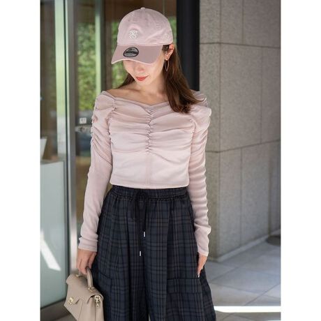 繊細なシアー素材に全体的なギャザーデザインを施し、着るだけでこなれ感を演出できるカットソー。ほどよく開いたデコルテラインが女性らしさを引き立て、抜け感のある印象に仕上げてくれます。単品使いはもちろん、ジャケットやカーディガンなどアウターとのレイヤードにも好相性で、ロングシーズン活躍する万能トップスです。