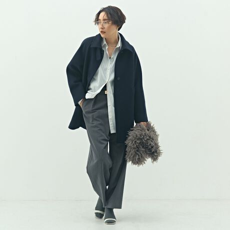 ・高品質なサスティナブルウール素材(リサイクル原料)を使用した二重織のハーフ丈のウールコート