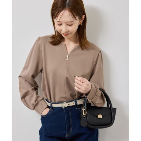 ・衿ぐりはスキッパーデザインで程よい抜け感を出し、パールをあしらってオンオフ兼用で着回せるアイテム。