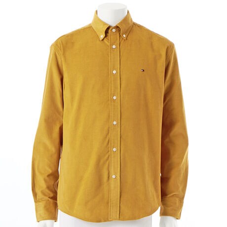 無地のコーデュロイシャツ。シンプルなデザインで、コーデュロイならではの豊かなテクスチャーと深みのあるカラーが際立ちます。左胸にはさりげないフラッグロゴの刺しゅう入り。襟は形をきれいに保てるボタンダウン仕様で、後ろ身頃には肩まわりの動きをスムーズにするセンターボックスプリーツを施しました。