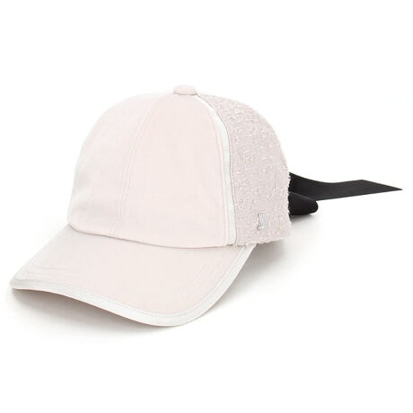 光沢感が上品さを演出してくれるベロア素材と、フィルムヤーンが織り込まれているジャガード生地との掛け合わせのベースボールキャップです。部分的にグログランのリボントリミングがランバンオンブルーらしく、大人可愛らしさを出しています。おでこに当たる汗止めすべりにはファンデーションの汚れが落ちやすい抗菌・防臭素材を使用し、サイズ調整も可能です。
