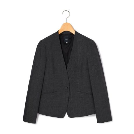 [型番:78259131011]クラシックなムードのバーズアイ生地で仕立てた1つボタンジャケット。衿のないすっきりとしたノーカラー仕様で、様々なブラウス、シャツ、トップスと好相性。袖先のスリット、立体感のある美しいシルエットもポイント。シンプルなデザインで、ビジネスからお出かけまで様々なスタイリングで重宝する一枚です。※商品画像はサンプルを使用しているため、実際の商品と色味などの仕様が異なる場合がございます。予めご了承ください。