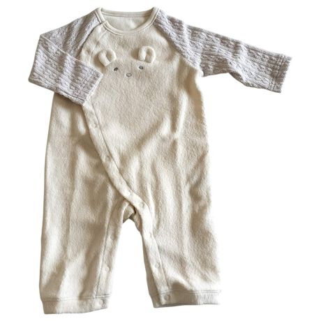 オーガニック起毛パイルを使用したあったか素材のカバーオールです。胸に配置された耳のモチーフがかわいらしいモデルです。