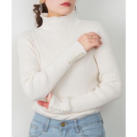 リブニットガーリーっぽさもあるメロウ襟のタートルリブニット。