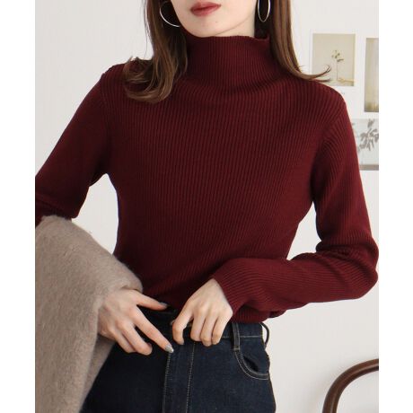 首元を立ち上げたネックデザインで、きちんと感と女性らしさをプラス。シンプルで合わせやすいリブニットはシルエットの良さが人気の秘密。
