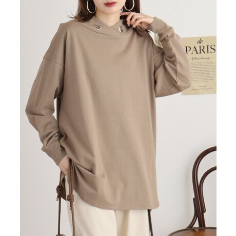 襟に大き目のアイレットがついたハイネックプルオーバー。