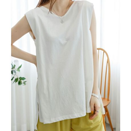パワーショルダーなシルエットが旬な印象のノースリーブカットソー。
