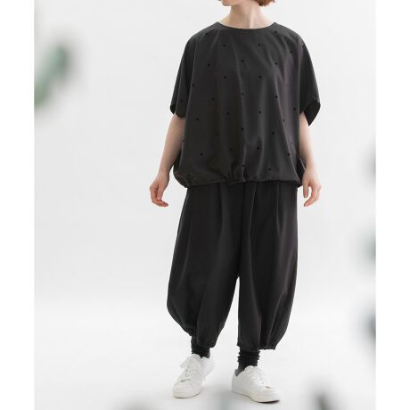 大きく膨らんだ8分丈バルーンパンツ。秋や春の端境の季節のきちんとしたい時期に重宝するフォーマル生地の「トロピカル」で仕立てました。ポリエステルレーヨンで、しわになりにくくイージーケアがうれしいシリーズです。脇が丸くなるように裾は脇だけゴムでギャザーを寄せています。ほっこりしたシルエットと、きちんと感のあるフォーマル素材の組み合わせがモードなアイテム。ウエストはゴム仕様でリラクシーな履き心地。両サイドポケットにはスカラップステッチを入れてさりげないアクセントを効かせています。