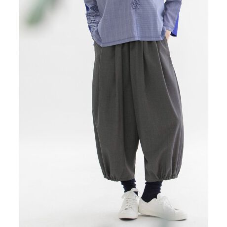 大きく膨らんだ8分丈バルーンパンツ。秋や春の端境の季節のきちんとしたい時期に重宝するフォーマル生地の「トロピカル」で仕立てました。ポリエステルレーヨンで、しわになりにくくイージーケアがうれしいシリーズです。脇が丸くなるように裾は脇だけゴムでギャザーを寄せています。ほっこりしたシルエットと、きちんと感のあるフォーマル素材の組み合わせがモードなアイテム。ウエストはゴム仕様でリラクシーな履き心地。両サイドポケットにはスカラップステッチを入れてさりげないアクセントを効かせています。
