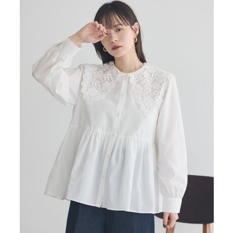 レース襟とフレアシルエットがフェミニンな印象のブラウス。フラワーモチーフの繊細なレースで顔周りに華やぎを与えます。コットン混のハリのあるテキスタイルでよりきれいめに演出。ストレートのパンツや女性らしいナロースカートにも合わせられるおすすめのアイテムです。