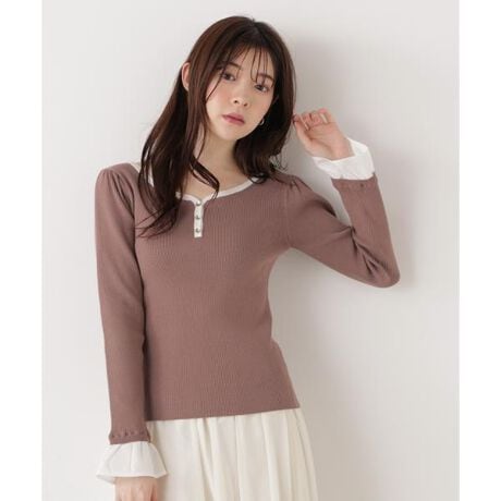 トレンドの異素材ドッキングニットです。フレアカフスがレイヤード見えするドッキングデザイン。襟ぐりと袖口をワントーンにまとめて統一感を出してます。フェミニンな雰囲気のハートネックとフロント釦もポイント。キレイめスカートやパンツ、カジュアルなデニム合わせもお勧めです。