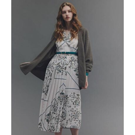 クラシカルなスカーフ柄が印象的な、上品で華やかなプリーツワンピース。上身頃はテーラードカラーとダブルブレストデザインでトラッドな雰囲気に仕上げ、スカート部分はラップ風のプリーツデザインで動きのある美しいフレアシルエットを演出。ヒップ下から広がるプリーツが、女性らしさと上品さを引き立てます。ウエストの細ベルトとカフスにはカラー切り替えを施し、全体に華やかなアクセントを添えた、洗練されたクラシカルスタイルの一着です。
