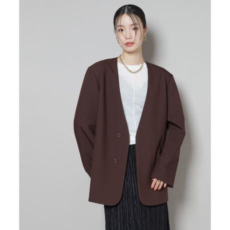 ワイドなショルダーとボクシーなシルエットがトレンド感のあるノーカラージャケット。同素材展開のパンツとセットアップで合わせたり、シャツやブラウス、タートルニットなど、幅広いインナーと合わせたスタイリングが可能です。