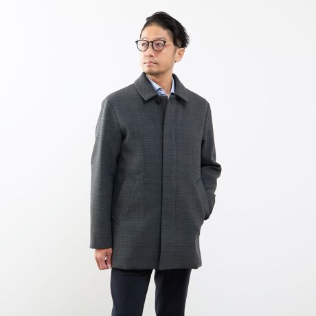 ウーステッド調のグレンチェックにウレタンボンディングを施した、中綿ライナー取り外し可能のミドル丈バルカラーコート。