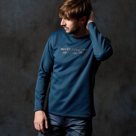 シャープな印象をあたえるメタルジェルプリントが特徴のクルーネック長袖Tシャツになります。