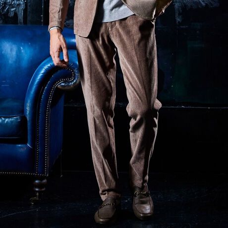 縦畝(ウネ)のコーデュロイとは違う、斜めの組織感が特長のカルゼ柄が上品さをかもし出します。