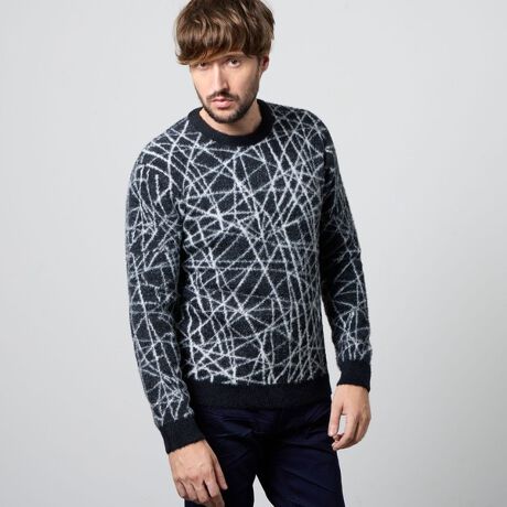 しなやかで柔らかい肌触りのポリエステルナイロンシャギー糸をジャカード゙編みで大胆な柄を表現しました。