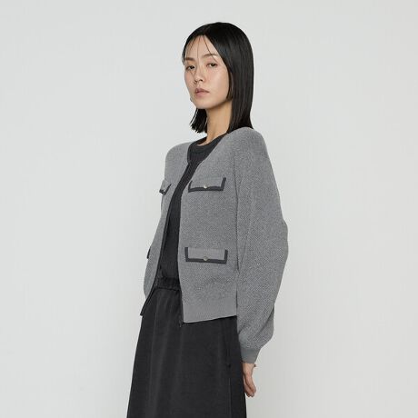 バイカラーのパイピングと見せかけのフラップポケットがポイントのモールジャカードジップアップカーディガンです。