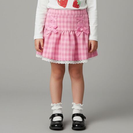 女の子らしい要素を詰め込んだギンガムチェックのスカートです。編み上げデザインと裾のレースが可愛さをより引き立てます。裏地つきの設計なのもうれしいポイント。カジュアルなTシャツから上品なブラウスまで、幅広いトップスと好相性です。【おすすめの着用時期は秋冬シーズン】