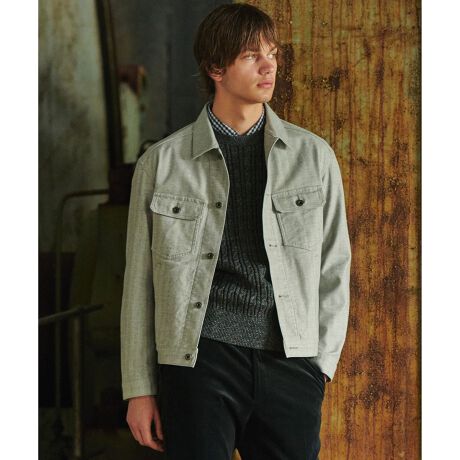 クラシックなGジャン型をベースにしたワークジャケットです。製品ボールバイオ加工を施すことで、こなれた洗い感をプラスし、ヴィンテージライクな表情に仕上げました。フロントにはJOSEPH ABBOUDのロゴ入りタック釦を配し、さりげないアクセントを加えています。ヘリンボン柄とメランジグレーの組み合わせが、大人の上品さを引き立てます。キレイ目にもカジュアルにも着用いただけるデザインです。