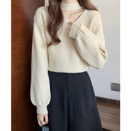 チョーカー風デザインが目を惹く、フェミニンなニットトップス。