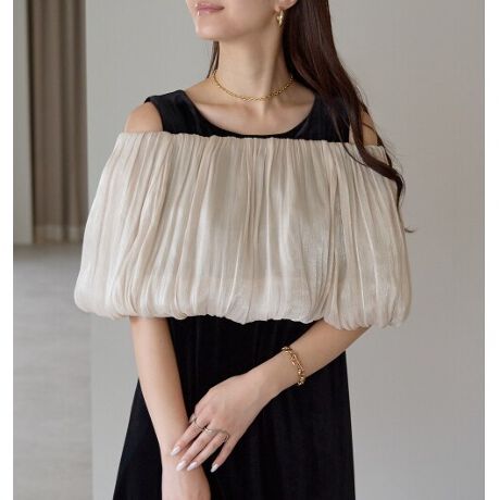 ラメ楊柳のスヌードは上部分がゴムシャーリング仕様で着用するスタイリングでロール襟にしたりオフショルダーに出来るので