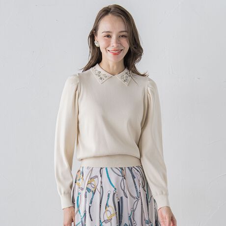 【デザインの特徴】ビジューデザインがポイントのポロ衿ニット。
