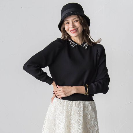 【デザインの特徴】ビジューデザインがポイントのポロ衿ニット。