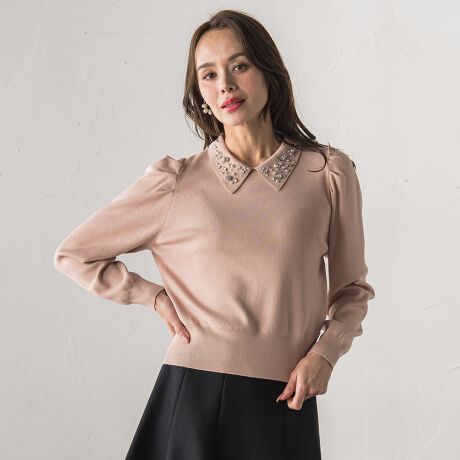 【デザインの特徴】ビジューデザインがポイントのポロ衿ニット。