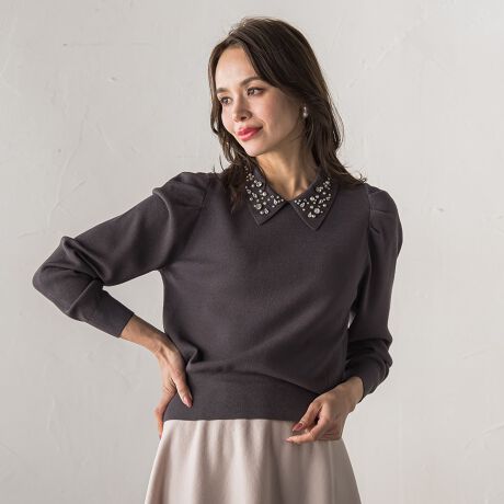 【デザインの特徴】ビジューデザインがポイントのポロ衿ニット。