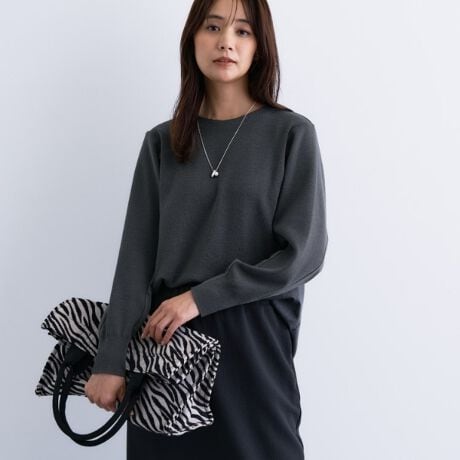 着痩せ効果のある身頃の脇と袖下に布帛をドッキングしており、長い時期ご着用頂けます。