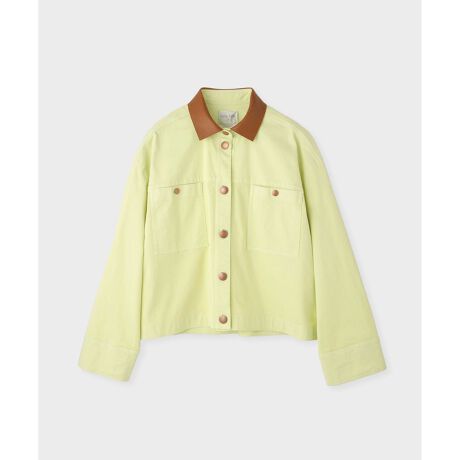 マニッシュなカバーオールのシルエットに、襟元のレザーが洗練されたアクセントを添え、端正な佇まいを演出。