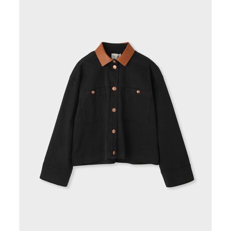 マニッシュなカバーオールのシルエットに、襟元のレザーが洗練されたアクセントを添え、端正な佇まいを演出。
