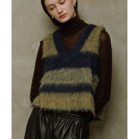 3色の計算されたマルチボーダー柄の編地に起毛加工を施し、ふっくらとボリューム感を出したニット。