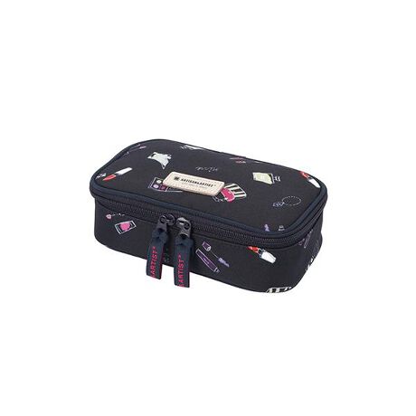 子どもの頃に憧れたコスメやハイヒール、ジュエリーたち・・・。そんな甘い記憶を呼び覚ますようなモチーフを散りばめたイラストが特徴のシリーズ。深みのあるネイビーのベースに、カラフルなアイテムが軽やかに描かれ、可愛らしさと大人の遊び心が同時に表現されています。こちらは、ハンドルに指を通して手のひらに乗せると、ハンディ・メイクドレッサーに。ポーチを置く場所を探す必要がなく、手のひらの上でもぐらつかないので化粧直しなどのシーンに便利です。ファスナーは3面しっかり開くため、中身の出し入れもしやすい仕様。メーンスペースには仕切りやポケットを付けないことで収納時の自由度がアップしています。ポーチ内に小さなミラーを立てかければ鏡のない状況でもメイクが確認できます。※写真はイメージです。実際はポーチのみの販売となります<商品詳細>・素材:[表]ポリエステル(撥水加工) [裏]ナイロン・サイズ:W150×H50×D80mm・カラー:ネイビー(NVY)・原産国:日本