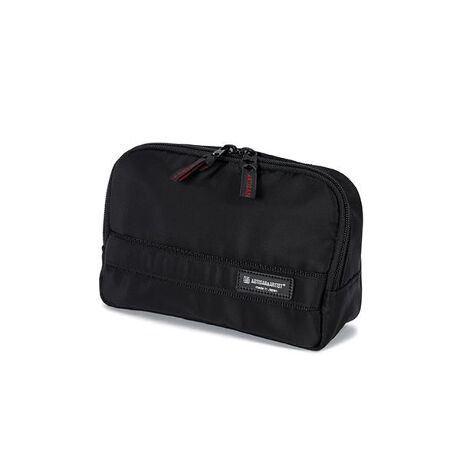 ブランドカラーの黒と赤を基調としたシンプルでベーシックなシリーズ。カラー同士のコントラストがシックな魅力をもたらすと同時に、個性とエレガンスを際立たせるようなデザインです。こちらは、トップからの斜めのカッティングにより、スマートかつコンパクトでありながらも収納力のあるポーチ。ファスナーを開くとフロント部分の上半分が手前に倒れるつくりで、中身が見渡しやすいうえ、アイテムの出し入れもスムーズです。2つのブラシホルダー、スティックアイテム用ポケット付き。ホルダーとポケットの向き・位置は、手前と奥とで交互に配置されており、ファスナーを閉じたときにアイテムの厚い(太い)部分同士が重なるのを防げるため、スペースを有効利用できます。※写真はイメージです。実際はポーチのみの販売となります。<商品詳細>・素材:[表]ナイロン(表地撥水加工) [裏]:ナイロン・サイズ:W180×H110×D60mm・カラー:ブラック(BLK)・原産国:日本