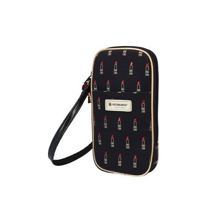 ブラックのベース生地に、メタリックなラメ糸で織られた真紅のリップスティックとゴールドカラーのパイピングがきらめく“ヴァリアント・ルージュ”シリーズ。大人可愛いデザインで人気(*)の、こちらのコレクションにグラスポーチが仲間入りしました。メガネやサングラスの収納を考え、インナーの生地にはベロア調の柔らかい生地を使用。中の空いたスペースは、コンタクトや目薬、メガネ拭きなどを入れるのに便利です。小さく薄マチなのでバッグの中でかさばりにくいデザイン。ストラップ付きなので、バッグのハンドル部分へ取り付けたり、ウォールフックやキーフックなどへ掛けることもできます。外側のポケットはティッシュがぴったり入るサイズ。コスメアイテムの収納にもおすすめです。(*)「アルティザン・アンド・アーティスト」においての人気シリーズということ※写真はイメージです。実際はポーチのみの販売となります<商品詳細>・素材:[表]ポリエステル/コットン/ラメ(撥水加工) [裏]ポリエステル・サイズ:W90×H170×D25mm・カラー:ブラック(BLK)・原産国:日本