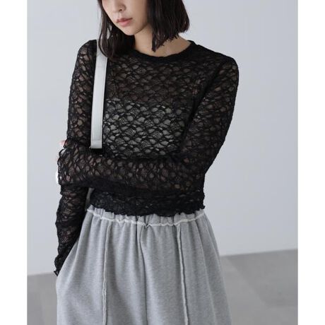 昨シーズンご好評いただいたトップスが、新色ブラウンカラーを加えて再登場!コンパクトなサイズが可愛いレーストップスです。凹凸のあるレースを使用しているのでのっぺりして見えず表面感があります。袖口・裾はメロー仕様でさりげなく抜け感をプラス。サイズがコンパクトなのでダボっとしたデニムやスラックス合わせがおすすめ。華やかなレースアイテムは、一枚着としてもインナーとしても着用いただけるのがポイントです。※モデルの着用画像の場合、光の当たり具合により、実際の色味と異なって見えることがございます。色味は、商品単体の画像をご参照ください。