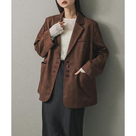 柔らかく、肌触りの良いフェイクスウェードを使用したテーラードジャケット。少しゆとりのあるルーズなシルエットは、かっちりしすぎず、着るだけでこなれた印象を演出します。定番のベージュやブラウンだけでなく、市場でも珍しいブラックカラーもおすすめです。いつものコーディネートに羽織るだけで、ぐっと洗練されたスタイルが完成します。
