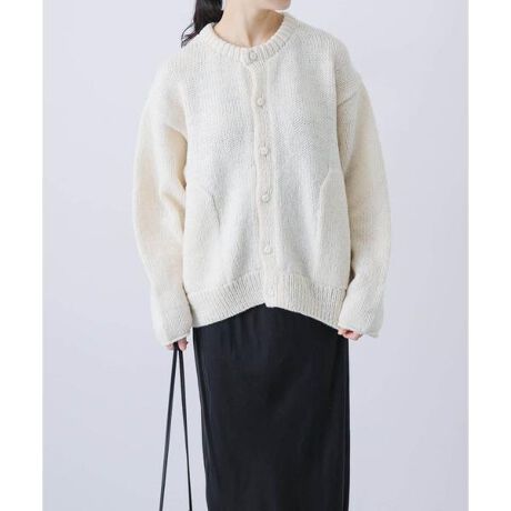 やや太めの糸で編み上げられたウール100%のアイテム。ゆったりしたサイズ感が華奢な雰囲気を演出し女性らしい印象に。見た目よりも軽いので気軽に着用いただけると思います。スカートやパンツはもちろん、ワンピースの上にレイヤードしたスタイリングもおすすめ。襟ぐりと裾のリブ使いがアクセントに。両脇にはポケットが付いていて、冬までの軽いアウターとしても重宝しそうです。シリーズで他のアイテムもご用意しているのでぜひご覧ください。